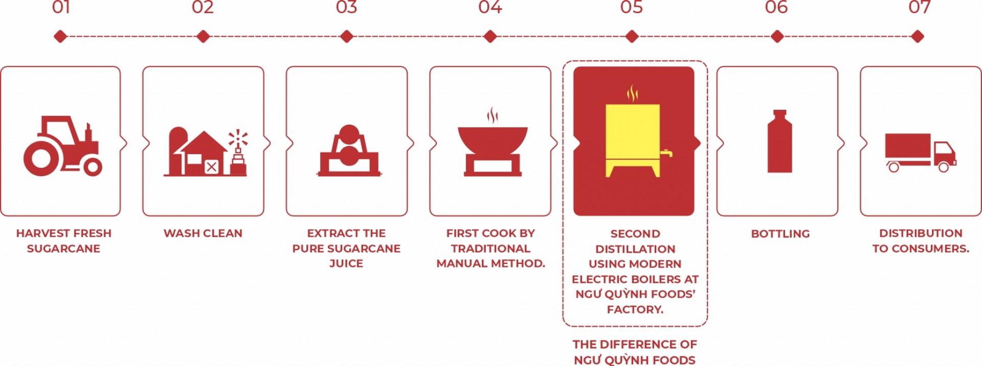 Ngu Quynh Foods' sugarcane syrup is made from a harmonious combination of traditional cooking methods and modern distillation technology, ensuring the preservation of its natural flavor and safety for health. The entire process takes place in a factory that meets food safety standards, and includes the following steps: