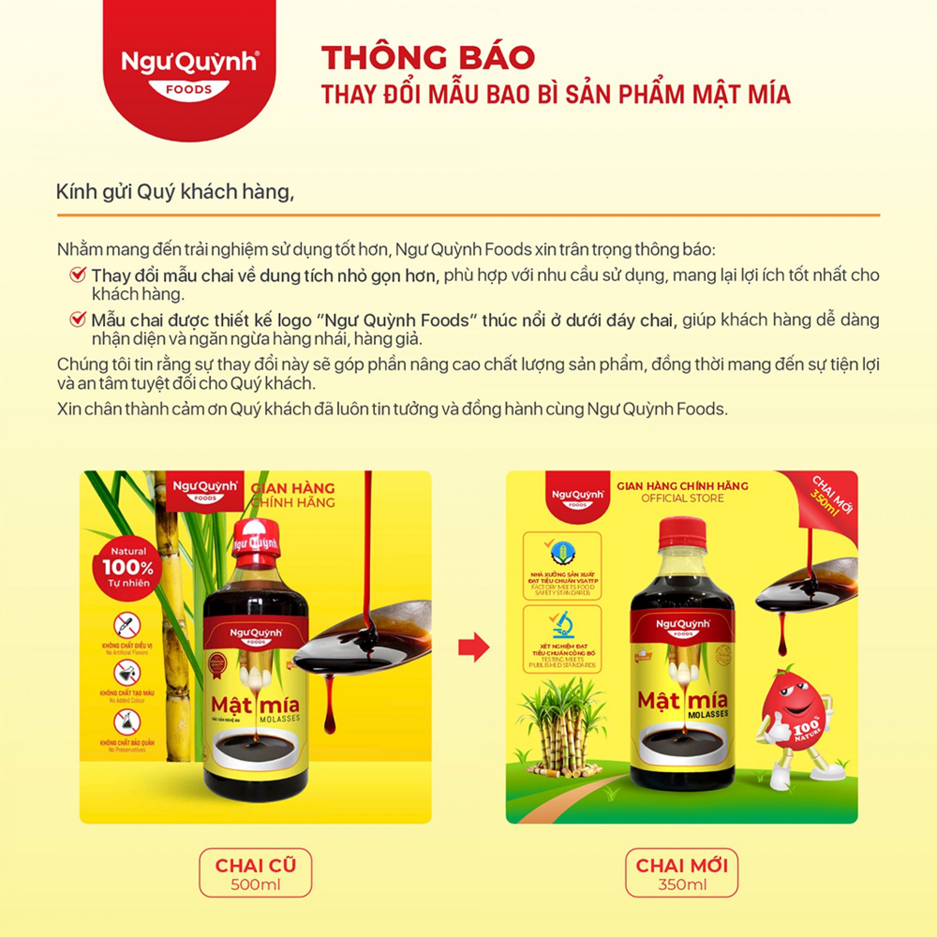 Chúng tôi sẽ thay đổi mẫu chai sản phẩm Mật Mía với dung tích nhỏ gọn hơn, tiện lợi hơn cho việc sử dụng và bảo quản, đồng thời vẫn giữ nguyên chất lượng thơm ngon, thuần khiết như trước.